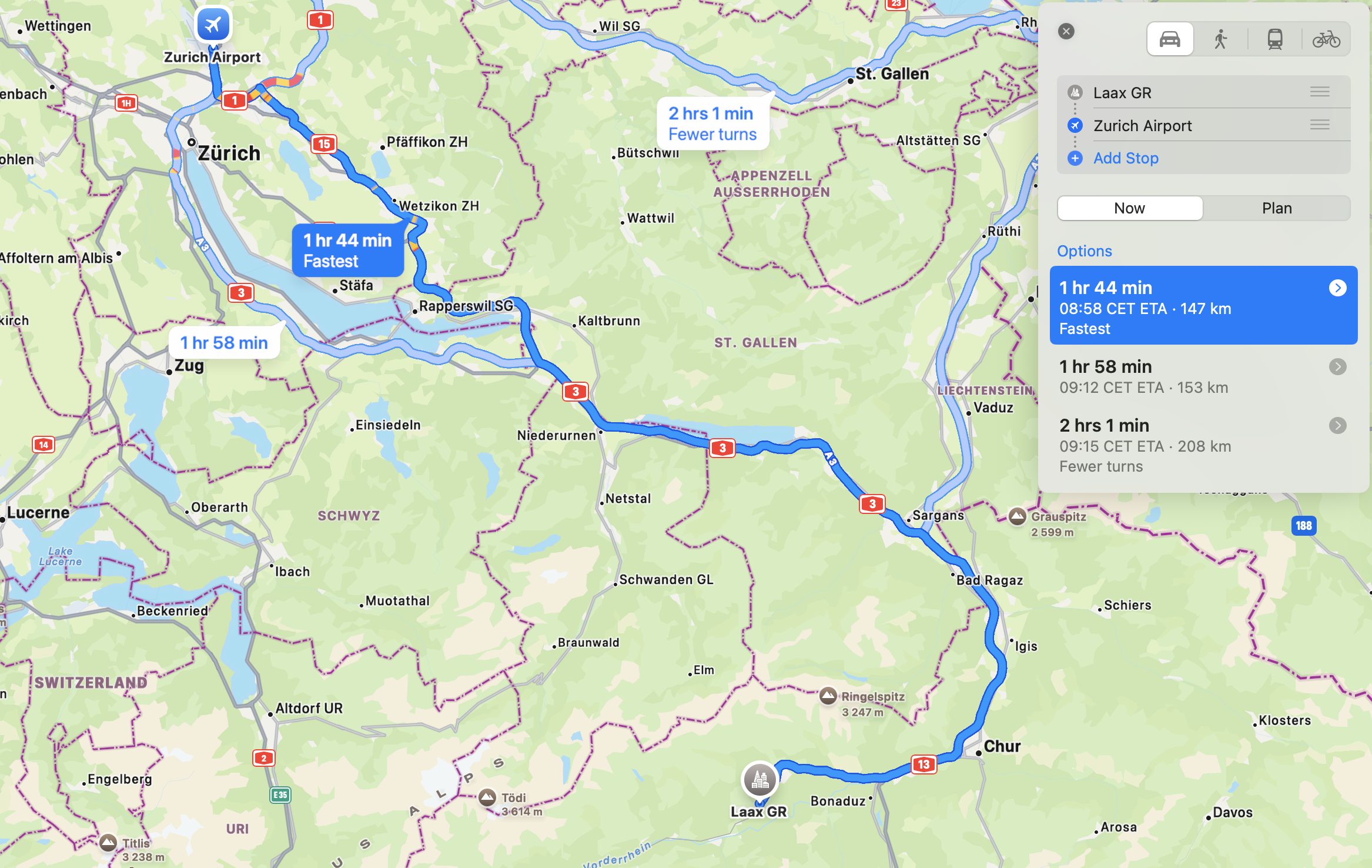 Zürichi lennujaam-Laax - 147 km/ 1.44 h jm