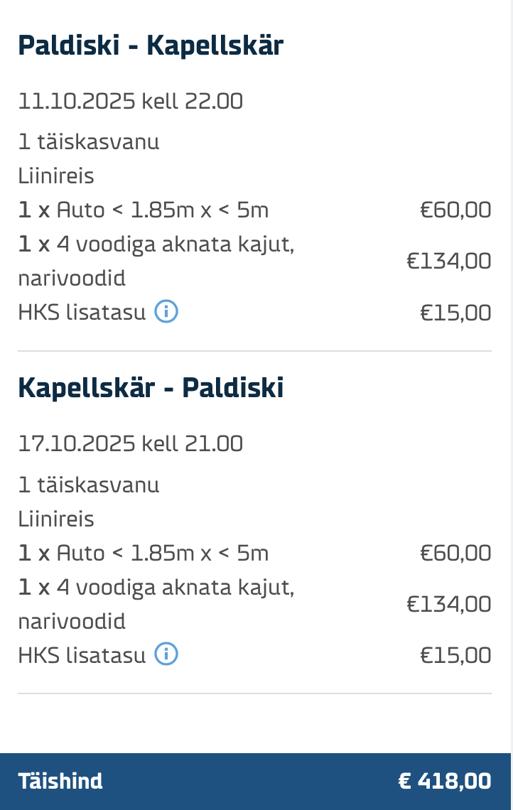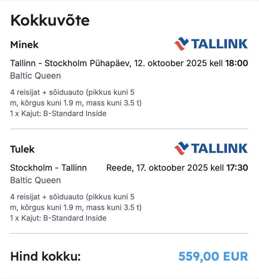 Tallink laevapiletid - 4 inimest ja auto 5 m - 559€